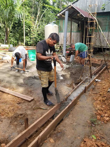 The ground inside the foundation was leveled, and low spots filled with waste concrete bits from the old bathrooms. The ground was thoroughly packed down where needed. Antonio (light green-T) spreads concrete "gravel", then he and Emerson (orange-T) place reinforcing bars on the false floor (falso piso) layer of cement (a 10:1 sand to cement mix), on which the final cap of stronger cement would be poured. The site forewoman, Miss Negra, inspects at center.