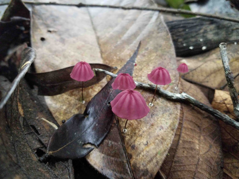 While most of the action of fungi is invisible to the naked eye, the spore-producing bodies (the mushrooms, toadstools, and whatnots) can be quite conspicuous. Many fungi are heavily fed on by beetles and fruit-flies which help to spread the spores widely. Marasmius species (lower left) have very delicate stalks and come in a wide flavor of colors.